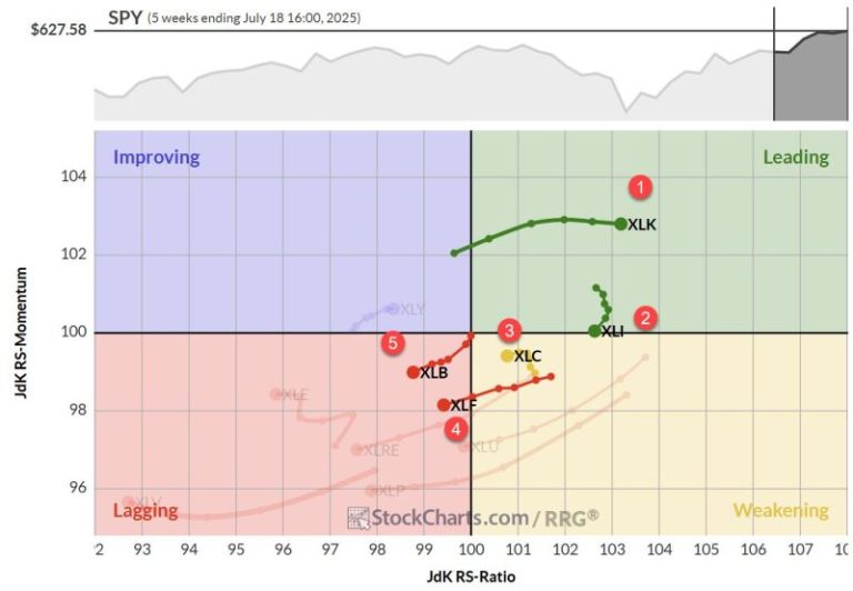 On the daily RRG, we’re seeing a nice rotation backup for tech while inside the weakening quadrant, a sign of strength that confirms the move on the weekly RRG. The raw RS line for tech is climbing almost straight up, reflecting very strong RRG lines. There might be a slight loss of momentum, but make no mistake, tech is still the strongest player in the game.
